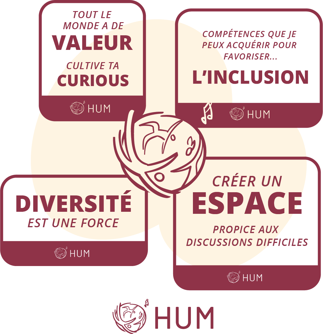 Tout le monde a de la valeur. Cultive to curiosité, exemple de message HUMCompétences que je peux acquérir pour favoriser l’inclusion, exemple de message HUMDiversité est une force, exemple de message HUMCréer un espace propice aux discussions difficiles, exemple de message HUM