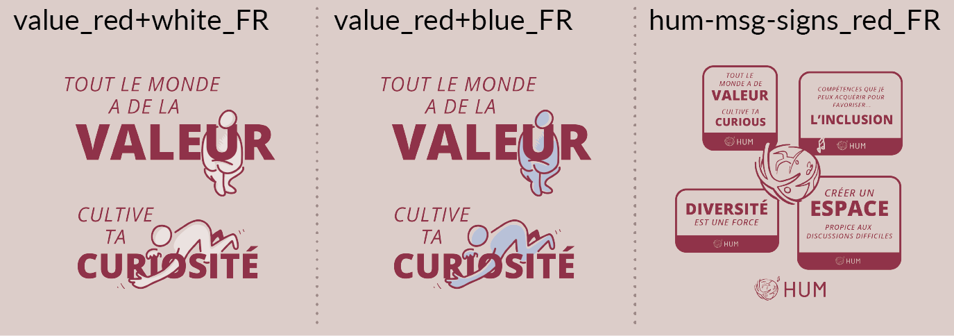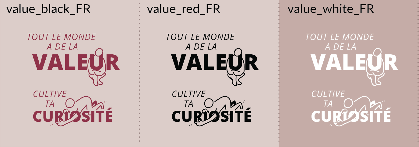 Les fichiers utilisent le modèle de nommage suivant: + trait de soulignement + . Exemple : « value_red_FR.png » indique « Tout le monde a de la valeur. Soyez curieux » en rouge. » dans la page Messages clés du document.